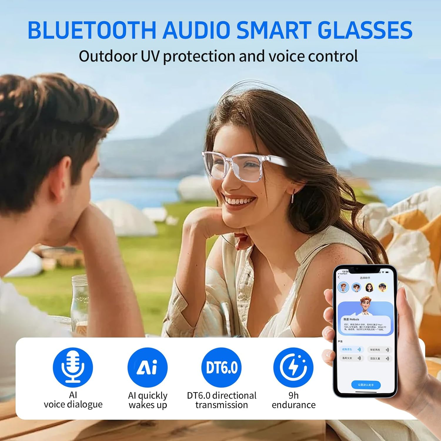AI Smart Glasses Bluetooth 5.4 Translator 160+ Languages UV400 Waterproof White