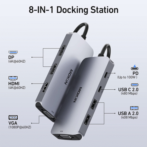 MOKiN 8-in-1 USB C Docking Station Dual DP HDMI VGA Hub with 100W PD